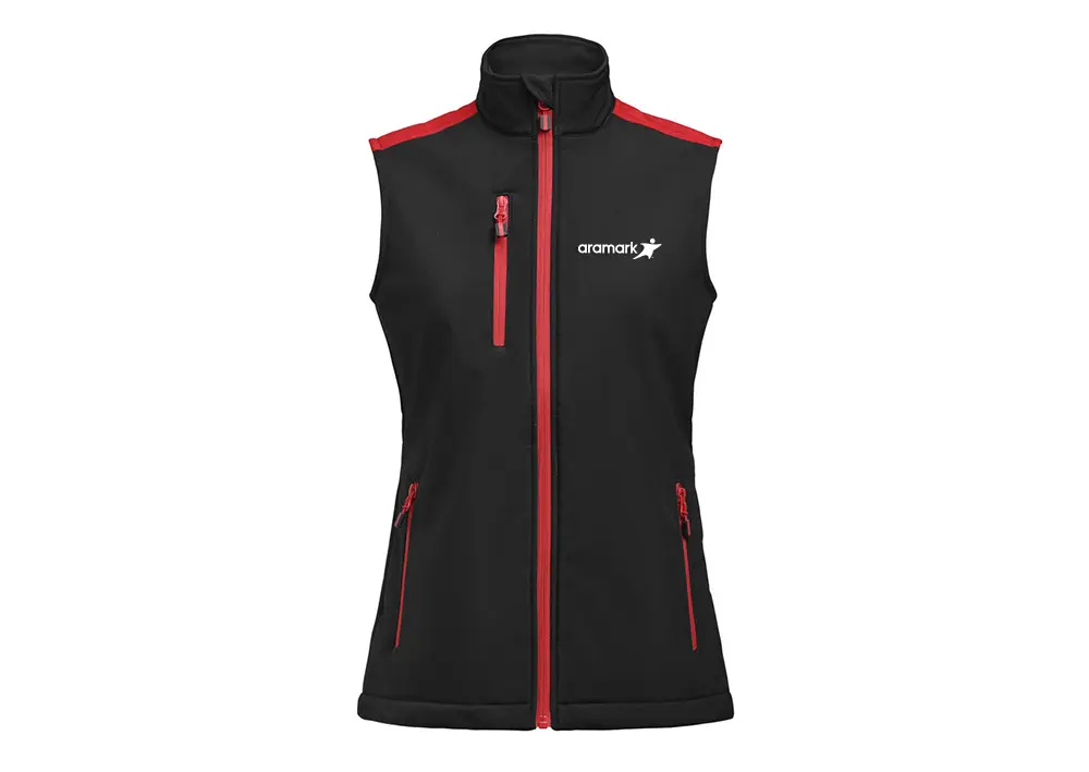 Zweifarbige Softshell-Weste. Kontrastfarbener Reißverschluss vorne und an den Seitentaschen.